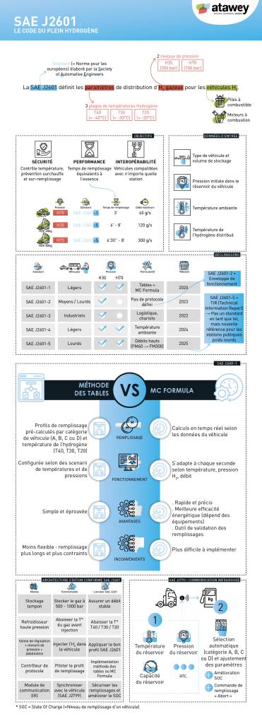 Pour une vision d’ensemble, consultez l’infographie en fin d’article : elle résume le protocole SAE J2601, ses variantes (J2601-1 à J2601-5) et les paramètres clés du remplissage.
